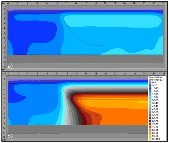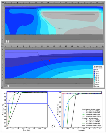 The main temperature effect of magmatic sills lasts only some thousand years (see e.g., [25]). In accordance with this, we have here assumed that the syn- and post-rift sediments (Figure 1) of the timestep with fault movement are deposited over a period of only some thousand years. Deposition of these sediments leads to thermal instability in the basin. Figure 5 shows the temperature difference between steady state and transient models for deposition of these sediments at 10,000 years (10 kyr) and 500 kyr after fault slip. This causes larger parts of the basin to have transient temperatures up to 20 °C lower than under steady state conditions even up to 500 kyr after fault slip (Figure 5). Around 10 Myr is required for the basin to reach steady state temperatures.