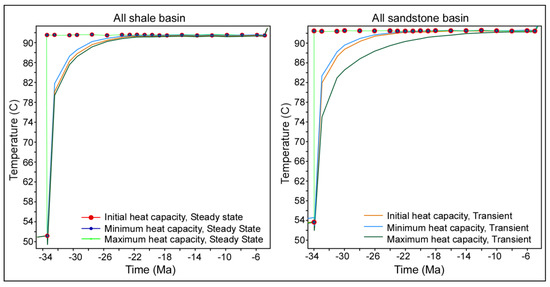 In the case where the thermal conductivity is fixed and the specific heat capacities are changed in the different modeling scenarios (Table 2, lower part), the steady state temperatures for all the scenarios are, as expected, the same (Figure 11). However, with increasing specific heat, the time needed for the basin to obtain steady state increases (Figure 11). This is especially visible in the point plot for sandstone basin in Figure 11, because of large difference in the published heat capacity values of sandstone, but the effect is also visible for the shale basin. For all tested scenarios steady state is obtained between 8–18 Myr after fault slip.