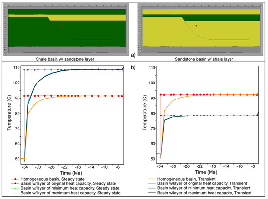 (a) Shale and sandstone basins with sandstone layer and shale layer respectively. The red point indicates location for point plot in (b). (b) Results show the temperatures for the three tested heat capacities for shale basin with one sandstone layer and sandstone basin with one shale layer. For comparison, temperatures for homogeneous basin are also plotted. For heat capacity values see Table 2.