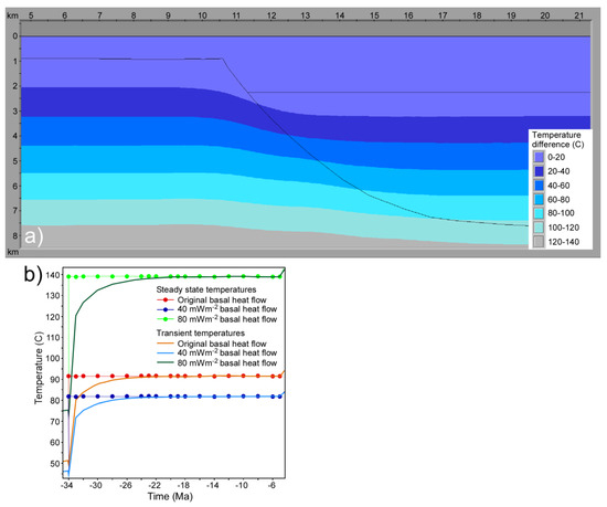 (a) Thermal difference between transient temperatures in basin with basal heat flow of 80 mW·m−2, to basin with basal heat flow of 40 mW·m−2 at 10 kyr after fault slip. (b) Results show the temperatures for the default and the two extreme values for heat flow: 47 mW·m−2, 40 mW·m−2, and 80 mW·m−2. Location of studied point is indicated in Figure 8b.