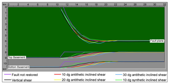The present study utilizes vertical shear as a standard fault reconstruction method. However, different segments of simple shear, including inclined antithetic and synthetic shear are explored (Figure 2). Furthermore, we investigate how the different resulting geometries impact the thermal history. Because BMT restore faults solely by vertical shear, and the software Move (Petex Ltd.) does not have the ability to perform thermal and maturation modeling, both Move and BMT were used to model the structural development of the section. In the restoration process BMT and Move both use the backstripping process, which removes layers one by one and decompact the underlying sequences based on the given porosity-depth trend for the assigned lithology/lithologies. The porosity calculations are based on exponential functions (cf., [37]) and the same values are used in both softwares (Table 2). Move is a commercial software restoring geological cross sections by kinematic algorithms. Six algorithms are available for fault restoration, these are: simple shear, fault parallel flow, fault bend fold, fault propagation fold, trishear, and detachment fold. BMT is a non-commercial basin modeling software with the ability to perform fault restoration (by vertical simple shear) so that structural effects on temperature estimates are accounted for (cf., [26]).