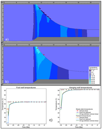(a) Temperature difference between a scenario restored with 30 degrees antithetic inclined shear, compared to a scenario with non-restored fault. (b) Temperature difference for a scenario restored with vertical shear compared to a scenario with non-restored fault. (c) Temperature point plot from foot wall (left) and hanging wall (right) in the two points indicated in (b).