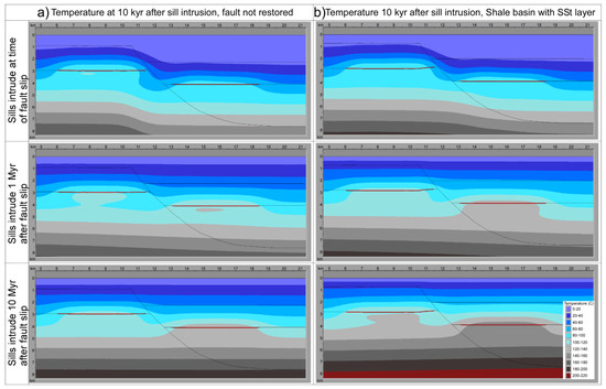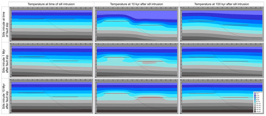 As mentioned above, earlier studies have pointed out the importance of host-rock temperatures at time of emplacement for the resulting thermal effects of intrusions [8,13,16,17,18]. In our study two sills, ~50 m thick, one in the hanging wall and one in the footwall, have been modeled to intrude the basin with increasing time lapse after fault slip. Figure 16 shows the results for sills intruding at time of fault slip, 1 Myr and 10 Myr after fault slip. There is a clear thermal instability on both sides of the fault zone. However, due to the masses of faulted rock and larger deposits of sediments in the hanging wall section, the thermal effects of the fault displacement are more pronounced here. Therefore, the largest differences in the thermal effects of the sills as time passes are expected to be found here.