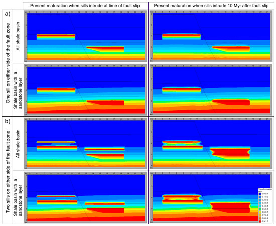 (a) Calculated maturation for one sill intruding on either side of the fault zone. (b) Calculated maturation for two sills intruding on both sides of the fault zone. Left side show results for sills intruding at time of fault slip. Right side show results for sills intruding 10 Myr after fault slip.