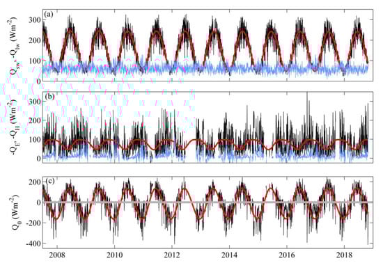 To assess changes in air–sea heat exchanges, we calculated the net heat flux from the ocean to the atmosphere (Q0), which is given by the sum of four components: QE, the latent heat flux; QH, the sensible heat flux; Qlw, the net longwave radiation flux; and Qsw, the net shortwave radiation flux (solar radiation) (Figure 2). Qlw and Qsw (radiative heat fluxes) can be obtained from the NCEP/NCAR reanalysis data set [] as daily values with a spatial resolution of 1.9° × 1.9°. QE and QH (turbulent heat fluxes) can be computed from atmospheric and oceanic AGL buoy measurements using the so-called bulk formulae (see [] for further information). In this case, we used the Fairall algorithm [], which is one of the most popular algorithms based on the bulk formulae, to compute turbulent heat fluxes from AGL buoy data.