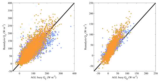 The suitability of the use of alternative reanalysis data from e.g., ECMWF (https://www.ecmwf.int/) and OAFLUX project (http://oaflux.whoi.edu/) [] have also been considered. Regarding the use of ECMWF reanalysis data, previous analyses have shown us limited sensitivity of the upper ocean response both e.g., in terms of SST or MLD variability to variation of atmospheric forcing reanalysis used for its investigation (NCEP/NCAR versus ECMWF) [,]. Thus, we do not repeat these sensitivity analyses here and refer the reader to these manuscripts [,]. On the other hand, OAFLUX project provides global time series of daily ocean latent and sensible heat fluxes at 1° × 1° spatial resolution combined with existing radiative heat flux products from ISCCP on OAFLUX grids. Radiative heat fluxes time-series provided by OAFLUX project ends in December 2009. Thus, their use for comparison with AGL buoy data starting in June 2007 is discarded, since they provide a short time-series for comparison. OAFLUX turbulent heat fluxes continue to present and have been compared with those provided by NCEP/NCAR reanalysis and estimated from AGL buoy data (Figure 3). As expected, it is observed how NCEP/NCAR reanalysis overestimates heat fluxes for large heat loss events (heat loss by the ocean surface is shown as positive values) []. However, in general, the cluster dispersion from OAFLUX data with respect to AGL buoy estimations is larger than from NCEP/NCAR reanalysis. Moreover, for the time period of the year of interest—between April and May—in this study, the mean values of QE(QH) vary between 50.16 ± 40.87 (5.74 ± 11.49) W·m−2 estimated from AGL buoy data; 52.52 ± 46.56 (8.79 ± 14.39) W·m−2 obtained from NCEP/NCAR reanalysis; and 48.03 ± 31.41 (10.60 ± 14.23) W·m−2 from the OAFLUX project. Since large heat loss events overestimated by NCEP/NCAR Reanalysis are not the focus of this work, NCEP/NCAR Reanalysis data set shows better agreement with the AGL buoy heat flux estimations for the time-period of interest in this study. Thus, they are the only reanalysis data used hereinafter in this paper.