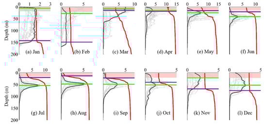 Fluorescence profiles obtained at SATS oceanographic station from January to December. All profiles taken from January 1998 (beginning of the use of CTD equipped with fluorescence sensor) to December 2018 are included and plotted in the corresponding month (grey thin profiles). Randomly, for each month, one profile is highlighted (black profile), also showing its corresponding 5 m low-pass filter profile (thick grey) and the depth at which fluorescence shows its maximum value on this filtered profile (green line). For these randomly selected fluorescence profiles, their corresponding density profiles are also shown (red line) as well as the estimated MLD (purple horizontal line). The x-axis only shows the fluorescence scale (density profiles were re-scaled to be shown on this scale since the interest is the upper ocean vertical structure, which is observable just from density profiles topology). Note that the x-axis is not the same for the different subplots. The pink shadow area in each subplot shows the depth range integrated by satellite measurements (1/5 of the euphotic zone calculated as the depth at which 1% of the PAR at the surface penetrates []).