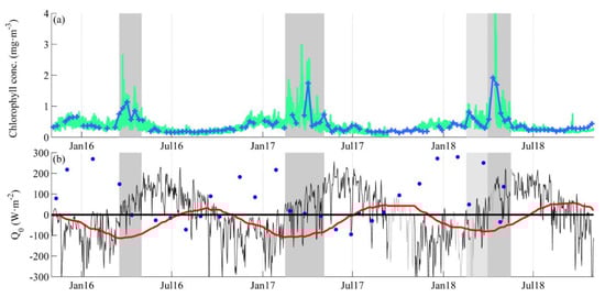 (a) Surface chlorophyll concentration derived from AGL buoy hourly fluorescence measurements at 3 m depth (green line) and from weekly satellite-derived Chlorophyll a concentration from GlobColour project (blue cross line). (b) Net heat flux (Q0) (black line) from the ocean to the atmosphere (negative values imply a heat loss by the ocean). Gaps in Q0 time-series estimated from AGL buoy data are filled with that obtained from NCEP/NCAR reanalysis (grey line). Blue dots show the accumulated heat storage above the mixed layer depth (MLD) (Qstrg) estimated from hydrographic profiles from SATS oceanographic station. It is shown as −Qstrg to facilitate the identification of net heat loss events sufficiently negative to remove Qstrg above the MLD (Q0 < −Qstrg). The red curve shows the accumulated net heat flux. The grey shadow areas mark the time period each year between: (1) the initial moment in which the net heat flux becomes “effectively” positive (Q0 (black line) passes from negative to positive values and the accumulated Q0 starts to increase) and (2) the definitive cessation of convective mixing when the last net heat loss event sufficiently negative to reach the base of the MLD occurs (sufficiently negative to remove Qstrg above the MLD). In 2018, a first small peak in near-surface Chl coinciding with a short-live Q0 > 0 event is highlighted in light grey. The largest peak occurs when Q0 becomes “effectively” positive.