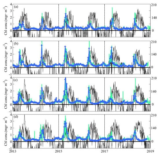 Surface chlorophyll concentration from daily (green line) and weekly (blue cross line) satellite-derived Chlorophyll a concentration from GlobColour project and net heat flux (Q0) (black line) from the ocean to the atmosphere (negative values imply a heat loss by the ocean) at different locations in the mid-latitudes of the Eastern North Atlantic. (a) at the grid centered at 44.76° N, 15° W from NCEP/NCAR reanalysis data. Chlorophyll time-series are obtained as the average daily and weekly time-series within this grid 44.76°N ± 1.9 /2° N and 15° W ± 1.9/2° E (NCEP/NCAR spatial resolution is 1.9° × 1.9°). (b–d) idem at the grids at 46.67° N, 5.62° W; 44.76° N, 9.38° W; and 42.86° N, 11.25° W. Chlorophyll concentration scale is shown in the left y-axis in mgr·m−3 and Q0 in the right y-axis in W·m−2.