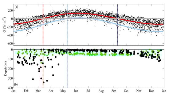 (a) Net heat flux (Q0) from the ocean to the atmosphere. All mean daily values registered since 2007 by the AGL buoy are shown (black dots). The climatological seasonal cycle obtained from these values is shown by the red line. The blue line shows the Q0 −2STD climatological cycle. (b) Depths of the Deep Chlorophyll Maximum (DCM) (green dots) and MLD (black dots) estimated on chlorophyll and density profiles registered at SATS oceanographic station. The vertical red line in (a) and (b) marks the date in which Q0 climatological seasonal cycle becomes positive. Idem for the light blue line and the Q0 −2STD climatological seasonal cycle. The dark blue line in (a) marks the date at which Q0 climatological seasonal becomes negative in late summer.
