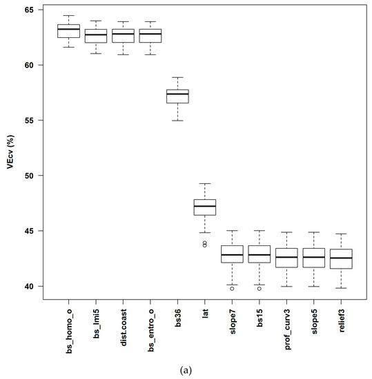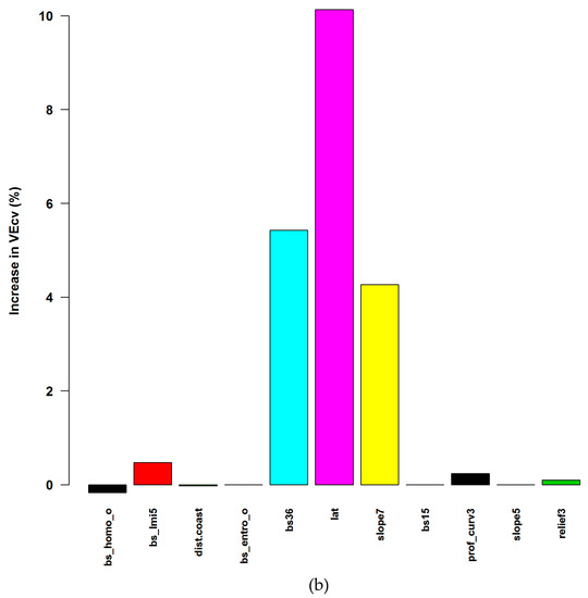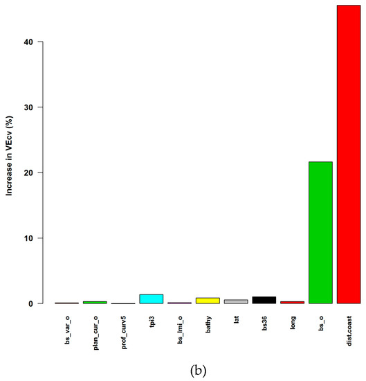 The predictive accuracy (VEcv) of RF gradually increased from model 1 (i.e., the model corresponding to plan_curv5) to model 34 (i.e., the model corresponding to bs23) in Figure 2a and reached a maximum VEcv for model 34. Sixteen important predictors were identified based on AVI (Table 5). The accuracy contributions of these variables varied from the most to the least in the following order: dist.coast, bs_o, lat, prof_curv5, bs36, bathy, bs_var_o, tpi3, long, bs_lmi_o, tpi_o, bs_entro7, bs25, bs15, bs_var5, and bs_entro5. However, the accuracy contributions of tpi_o, bs_entro7, bs25, bs15, bs_var5, and bs_entro5 were negative (Figure 2b).
