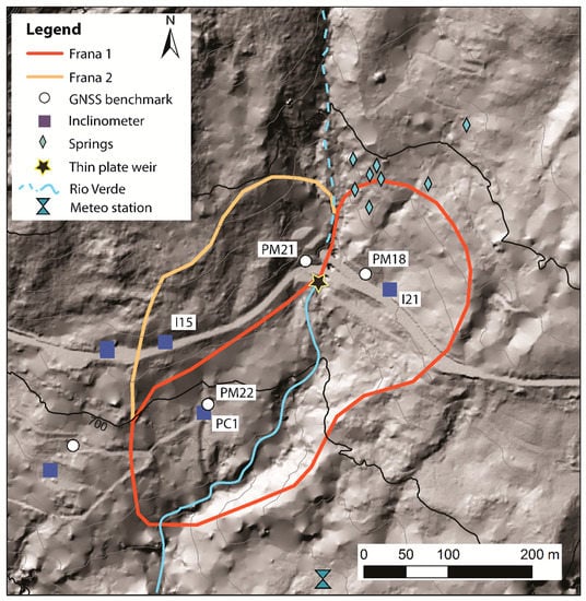 Frana 1-2 with active monitoring devices at the time of writing, location of the springs and location of the thin plate weir that measures the discharge of the Rio Verde stream. The I21 and PC1 superscriptions represent, respectively, the location for inclinometers I21, I21bis and I21ter, and of PC1, PC1bis and PC1ter.