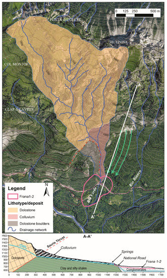 From the rock lithotypes and deposits viewpoint the upper basin’s area (about 1.52 km2) is characterized by the presence of tectonized dolomitic limestone of Monte Tiarfin Formation affected by karst phenomena. Downstream, the Frana 3 landslide back scarp deposit consisting of dolomitic boulders follows along with colluvium on the other side of the stream, on the hydrographic left (Figure 3). These two lithologies cover an extension of 0.096 and 0.065 km2 respectively. The three domains show different soil permeability: high for the landslide deposit, intermediate for the colluvium and low for the dolomitic limestone that is nevertheless highly fractured. The portion of the basin set on dolomitic limestone constitutes 95% of the total area, and it is separated from the lower portion of debris and colluvial deposits from a vertical rocky threshold that generates a 50 m high fall during rainfall events. The water coming from the upper part of the basin after the fall enters the large landslide boulders and is thereby dispersed, feeding the underground circulation of the right bank of the Rio Verde, into Frana 3, and almost not participating to the streamflow of the lower tract of the Rio Verde [35].