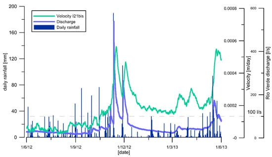 Correlation between the velocities of the landslides (calculated on windows of 1, 2, 3, 5 and 10 days) and rainfall, including hourly rainfall and accumulated rainfall (12 h, 24 h, 2 days 3 days, 5 days, 10 days), was tested with Pearson Product-Moment Correlation Coefficient (PPMCC); no significant correlation was found. On the other hand, a correlation between velocities of displacement of the landslide along the slip surface and discharge in the Rio Verde stream was found (Figure 4).