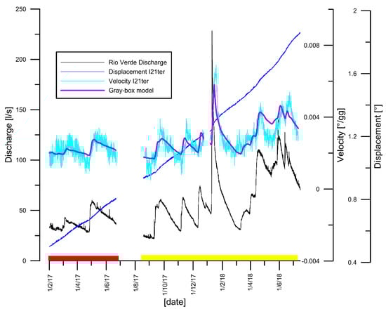The PPMCC between velocities measured on a 10-day time-lag in the I21ter and the flow of the Rio Verde was 0.81 for the first 4 months of 2016. In the following months of 2016, some problems in the discharge sensor generated unreliable measurements. For the time period 2017–2018, the PPMCC value between discharge in the Rio Verde stream and velocity in a 10-day time-lag in inclinometer I21ter was 0.82.