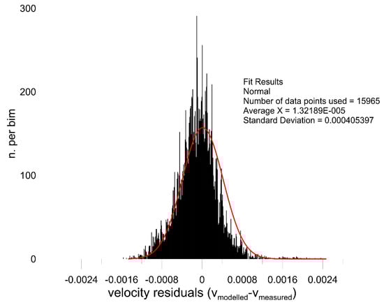 Histograms of the residuals between modelled velocities and actual velocities.