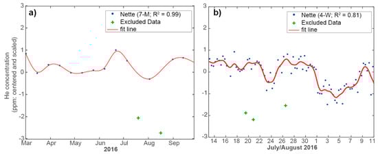 Fluctuation patterns of helium concentrations before (blue dots) and after centering/scaling and applying the smoothing spline method (red line) for the Nette mineral spring for (a) the 7-month biweekly and (b) the 4-week 8-hourly measurement campaigns. Measured data >1.5 standard deviations from centered and scaled data were excluded from analysis (green crosses) for being outliers.