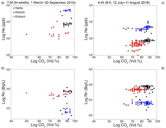 He versus CO2 and Rn versus CO2 plots (Figure 3) for the 7-M and 4-W samplings showed similar distributions for He and CO2 in Kärlich and Kobern, likely indicating a tectonic linkage between both springs (Figure 3a,c). Higher He values corresponded to Nette, which is located at an intersection of an active fault system and close to a hot spot of earthquake activity (Figure 3a,c). Rn vs. CO2 plots showed similar results for Kärlich and Kobern for both samplings (Figure 3b,d).