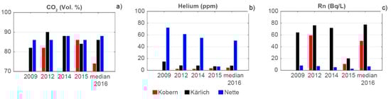 Concentrations of (a) CO2 (Vol.%), (b) Helium (ppm), and (c) Radon (Bq/L) in Nette, Kärlich and Kobern between 2009 and 2016. Concentrations for 2009–2015 are from [] and unpublished data for 2014 and 2015 by G.M. Berberich.