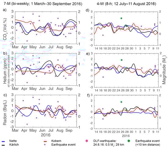 Patterns of gas concentrations (centered and scaled data) during the bi-weekly (a–c) and 8-hourly (d–f) surveys in the mineral springs and earthquake events (ML) indicated with purple crosses. The deep low-frequency (DLF) earthquake on 24 June 2016 in Niedermendig is marked in magenta; earthquakes with a distance <12 km during the 4-W sampling are marked in green.
