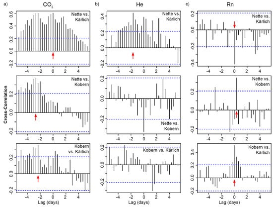 Cross-correlations for CO2 (Figure 6a) and He (Figure 6b) suggested that Nette and Kärlich were directly linked (CO2) and at an approximate lag of ≈2 days (40 h) for (He). Cross-correlations for Nette and Kobern (time lag of ≈2.5 days (≈64 h) for CO2), and Kobern and Kärlich revealed a positive but low relationship with a time lag of ≈2 days for CO2 (Figure 6a). Nette and Kärlich and Kobern and Kärlich were directly and instantaneously linked with respect to Rn (Figure 6c).