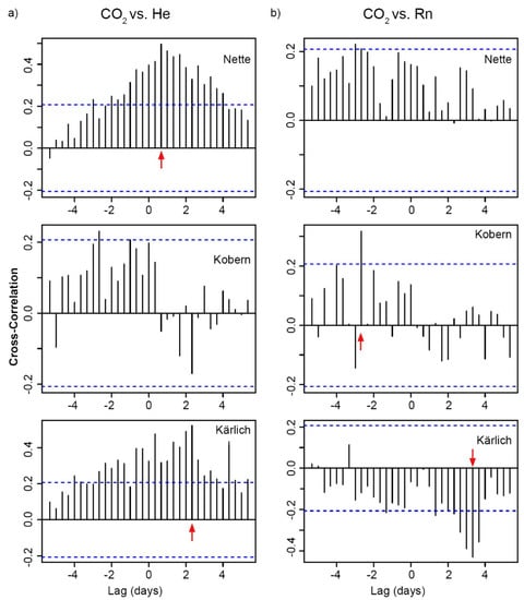 Joint visualization of the time-series of carrier-trace-gas couples reveal differences among the springs. A coupled system of CO2–He was visible in Nette (lag = 16 h) and Kärlich (lag = 56 h). The cross-correlation for the CO2–He couple in Kobern never exceeded 0.25 (Figure 7a). In Nette, no CO2–Rn coupled system was visible. In Kobern there was a positive but low relationship with a negative time lag of about ≈3 days for Rn, in Kärlich, we observed a small negative relationship with a negative time lag of ≈3.3 days (≈80 h; Figure 7b).