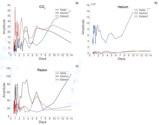 Common significant, short-synchronous degassing rhythms were observed for the springs and the gases after 1 day, 2, 3, 4, 5, 6, 8, 10 and 15 days (Figure 8; Table A2). Periods with maximal amplitudes were different for the investigated mineral springs and geo-gases in the soil. Maximum peaks for CO2 were observed for periods of 1 day (Kobern), 4 days (Kärlich), and 15 days (Nette; Figure 8a; Table A2). He maxima occurred for periods of 10 days (Kärlich) and 15 days (Nette, Kobern; Figure 8b and Table A2), whereas Rn maxima were observed for periods of 6 days (Kobern) and 15 days (Nette; Kärlich (Figure 8c and Table A2). The peaks corresponding to longer periods, e.g., of 30 days were not significant from a signal processing perspective and were discarded from further analysis.