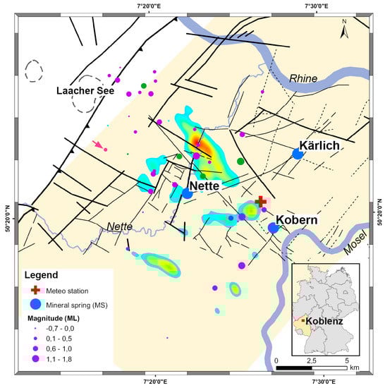 Until now, no continuous fine-scale degassing data have been available for the seismically active East Eifel Volcanic Field (EEVF) with its Quaternary alkali basaltic volcanism and adjoining Eocene Neuwied Basin (NWB) in state of Rheinland-Pfalz (Germany). Many volcanological, petrochemical, petrological, tectonic, and seismic investigations have been carried out in the last 40 years. Their focus was on dormant but not extinct volcanic activity [,]; ongoing magmatic recharge beneath Laacher See Volcano []; the present-day NW–SE-directed compressional stress field and its related seismic activity, e.g., []; isotopic investigations [,,]; gas composition and chemical tracers of mineral waters [,,,,]; and mofettes along the Laacher See or at Obermendig []. Data collection and monitoring has been annual at best, e.g., [], and no continual systematic long-term measurements or analyses of geogenic gas concentrations in mineral springs have been recorded. Furthermore, direct observations of periodic degassing behavior (e.g., from gas records themselves) are also still missing. This absence of information reflects a lack of data with high-time resolution of gas flux in an area where the current level of volcanic and magmatic activity is still disputed [].