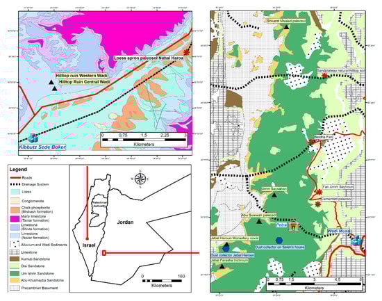 Widespread late Quaternary loess deposits can be found in the central and northern Negev desert. These testify to Pleistocene landscape changes, documented by variations of dust deposition, accumulation, and soil development [1,2,3,4,5,6,7,8,9,10,11,12]. Loess sediments also played a role for human activities during antiquity in the arid and semi-arid southern Levant. Specific adapted land use strategies, such as terraced runoff farming, harvested rainwater and sediments, enabling flourishing ancient cities like Avdat and Petra [13,14]. Loess in southern Jordan has been postulated [15,16], but has hardly been investigated. However, much less is known about dust settling and landscape changes during the Holocene, including how human activity interacted with climate fluctuations. This is partly due to a lack of Holocene sedimentary sequences. For example, Avni et al. [17] showed how natural incision of the Negev loess deposits during the Holocene led to landscape changes, which were slowed down by ancient agricultural terraces, as these controlled and reduced runoff.