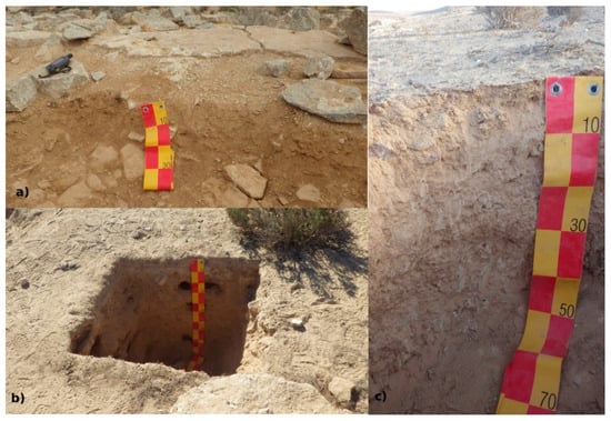 Studied profiles in the Petra region. (a) Soil cover on the debris in the northern courtyard of the monastery of Jabal Haroun, (b) Umm Saysaban (GPS and backpack give scale), and (c) the triclinium of Jabal Farasha. The tape measure is in cm. For a detailed description of the profiles, see Appendix A.