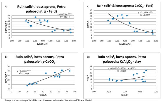 The pH-values are alkaline, between 8–9, while conductivities and contents of organic matter range mostly below 100 µm/cm and 0.6% Corg, respectively. Only one sample from the monastery cover shows an elevated conductivity of 1296 µS/cm and the paleosol below Shkarat Msaied has 1375 µS/cm. The elevated conductivity in the monastery might be connected with remains of mud mortar, which was possibly mixed with organic garbage, while the higher conductivity of the Shkarat Msaeid paleosol could be connected with its secondary carbonates or the possibility of a nearby spring in the past. Kinzel, M. [60] reported on water in ~1 m depth below the gravels of the nearby valley, which suggests occasional flooding of the paleosol during wetter periods, in particular if the past valley was less incised.