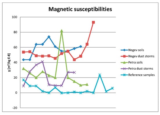 Numerical dates are not available at the other studied sites near Jabal Haroun, but the archaeological context of the ruins gives some indication of the age of the sediment. At Umm Saysaban, dust deposition in the structure probably started ~2500 BCE after the orderly desertion of the place [69]. Sandstone wall remains had completely filled with sediments, which means that deposition may not have continued until sampling, but stopped or was greatly reduced at some time in the past. There are no indications of mudbrick or mortar made of mud. Assuming ongoing sedimentation, the rate is 0.02 mm·a−1 (or 24 g m−2·a−1), but this is a minimum since it is unknown when the wall remains were covered and may have stopped collecting sediments.