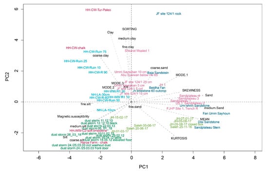 Statistical evaluation of particle size distribution was conducted using the Gradistat for Excel program [55] and using the EMMAgeo v0.9.4 R package for end-member analysis [56]. As well, we applied Principle Component Analysis (PCA) using the R-function prcomp [57] to describe similarities between the samples according to parameters of particle size distribution and magnetic susceptibilities. Furthermore, we utilized a non-parametric random forest approach using the R-package randomForest [58] to test whether particle sizes and magnetic susceptibilities are suited to distinguish between different types of deposit in this study (defined as current dust storm sediment, reference samples, and soils).