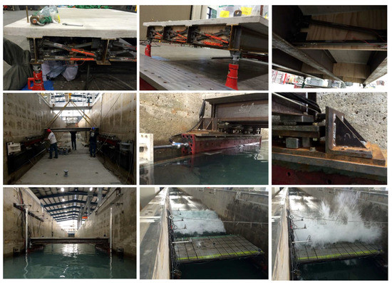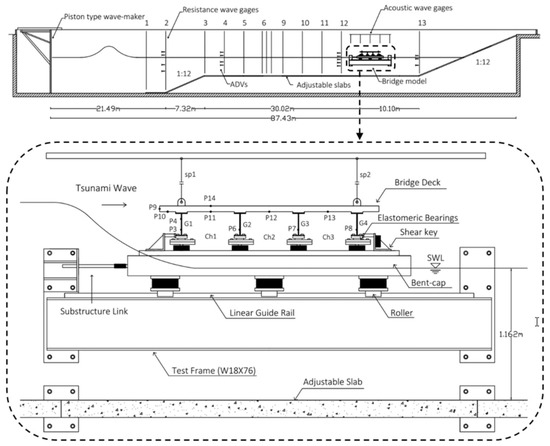 - Flexible elastomeric bearings that allowed the deck to move vertically and rotate along the longitudinal axis, simulating; therefore, the wave–structure interaction during the tsunami inundation; and