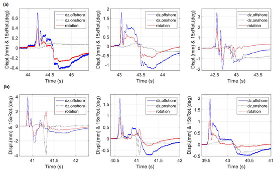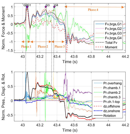 - Phase 3: In this phase the wave reaches the onshore chamber (Ch3), applying significant uplift on the deck and a counter-clockwise moment (negative value). This moment introduces counter-clockwise rotation of the deck, which is evidenced in Figure 5 by the reduction of the φ angle, which continues until the deck is perfectly leveled again. This phase is significant because it generates the maximum uplift in the onshore bearings. The phase ends when the wave has flooded all the chambers and it starts overtopping the deck.