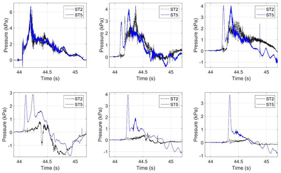 - Modifies significantly the wave flow in the chambers and introduces a different pattern of pressures on the girders and below the deck. However, the exact effect depends on the wave type. In the case of solitary waves, the pressure histories consistently (i) reach their maximum values before the wave reaches the girder and the deck, due to the fact that the wave pressure is transferred to the bridge through the compressed air; and (ii) have two characteristic peaks, smoother and with a longer duration than the case without trapped air, due to the nonlinear wave–air interaction and the cushioning effect. However, these effects are not always observed in the case of bores, revealing the existence of a more complex dynamic interaction between the air and the tsunami-like bores than in the case of simplified solitary waves.