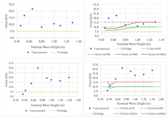 - The buoyancy of the bridge and the buoyancy of the trapped air assuming that 50% (Fb,brd+air50ch) or 100% (Fb,brd+air100ch) of the volume of the actual number of flooded chambers is filled with air. This is expected to be a more accurate representation because the previous section revealed that, due to the complex temporal and spatial variation of the wave loading, the maximum uplift can occur anytime during the inundation process (any phase) (e.g., when one chamber is flooded or when several chambers are flooded).