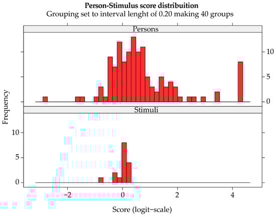 The targeting of the scale to the sample shows graphically how well individual stimulus difficulties and individual person abilities can be matched on common scale []. The average person ability and standard deviation indicate how well the scale is targeted to the sample [,]. Analysis of targeting also entails the assessment of floor and ceiling effects. Figure 2 shows that the overall targeting was very good. The difference between average person ability and average stimulus difficulty was equal to 0.726, namely the persons were a little more skilled than stimulus difficulty.