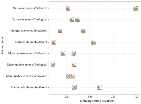 Second, we ran a GLMM with content type (natural, man-made, and person-related), class level, and gender as fixed effects; participants as the random effect; and content type scores as binary dependent variables. We found a significant effect of content type, χ2(2) = 58.15, p < 0.001. Post hoc tests indicated that the scores were significantly higher, z = 5.34, p < 0.001, EST = 1.82, for natural elements (M = 0.78, SD = 0.26, 95% CI: 0.73 to 0.82) compared to man-made elements (M = 0.37, SD = 0.29, 95% CI: 0.32 to 0.42), and in turn significantly higher, z = 4.38, p < 0.001, EST = 1.54, for man-made elements compared to person-related elements (M = 0.11, SD = 0.20, 95% CI: 0.08 to 0.15). No class level or gender differences emerged. See Figure 1 for response rates relating to content types (natural, man-made, and person-related) expressed in logit-scale.