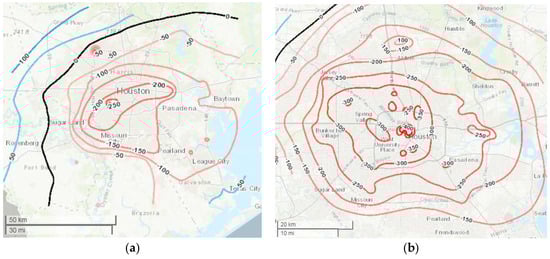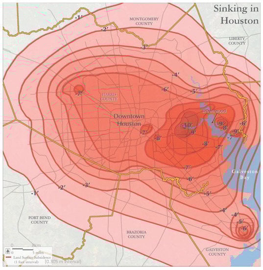 The observed land subsidence in the Houston-Galveston region [], a historical flooding zone frequently hit by hurricanes such as Harvey, Ike, Allison, etc. (−1’ = −.305 m; −2’ = −0.610 m; −3’ = −0.915 m; −4’ = −1.22 m; −5’ = −1.525 m; −6’ = −1.83 m; −7’ = −2.135 m; −8’ = −2.440 m; −9’ = −2.745 m; −10’ = −3.05 m). (Image from TexasLandscapeProject.org; Map sources from U.S. Geological Survey (USGS) []).