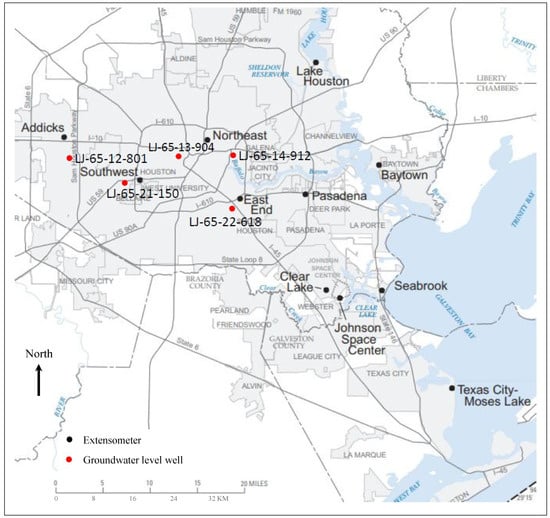 Location of borehole extensometer sites and selected groundwater level monitoring well sites, Houston-Galveston region, Texas []. (Note: The location of wells LJ-65-21-229 and LJ-65-21-227 is at the same location of extensometer Southwest). (Map source: USGS []).