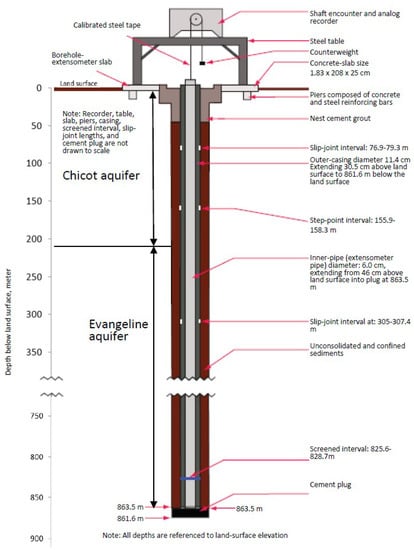 Figure 4 shows the 11 borehole extensometer station locations in the Houston-Galveston region []. There are two extensometers (shallow and deep) at Baytown and Clear Lake stations, respectively. Each of the other nine stations has only one extensometer. In total, there are 13 extensometers. Figure 5 shows one example of a borehole extensometer at Pasadena in this region. Based on Gabrysch (1984) [] and Kasmarek et al. (2015) [], a borehole is first drilled to a predetermined depth, generally below the depth of expected water-level decline in order to construct an extensometer (example shown in Figure 5). A steel outer casing with a slip joint and screened interval is installed in the previously drilled borehole. The slip joint helps to prevent crumpling and collapse of the well casing as compaction of subsurface sediments occurs, while the screened interval allows groundwater to enter the outer casing and inner casing (piezometer) so that the depth to water below land surface can be determined for the aquifer at the depth of the screened interval. A substantial concrete plug is installed and set at the base of the extensometer, and after the concrete plug hardens, the smaller diameter inner pipe (often referred to as the ‘extensometer pipe’) is inserted down hole inside the outer casing and positioned to rest on the upper surface of the concrete plug at depth. Therefore, this rigid inner pipe extends vertically from the top of the concrete plug to slightly above land surface, thus providing a fixed reference elevation above land surface for measuring changes in land surface elevation. At land surface, a concrete slab is poured and connected to an array of vertical concrete piers extending down into the water table. The concrete piers connect the slab to the underlying unconsolidated sediments penetrated by the borehole; this construction design helps to eliminate the continuous shrink and swell of the surficial clayey sediments associated with soil-moisture changes. A metal gage house (not depicted in Figure 5) is constructed on a concrete slab, and a shaft encoder and analog recorder are mounted to a steel table that is attached to the extensometer slab. A calibrated steel tape connects the recorder to the top of the inner pipe; because the steel table is anchored to the concrete slab, changes in land-surface altitude can be accurately measured and recorded. These recorded values through time represent the cumulative compaction that has occurred at the extensometer site. Because the extensometer functions as a piezometer and an extensometer, the cause and effect relation between the changes in water level in the aquifer and the changes in land-surface elevation can be established.