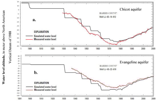 The lowering of groundwater level in the Houston-Galveston region due to groundwater withdrawal in Section 5.1 was observed by the USGS and simulated by them with MODFLOW []. Based on simulated results in Figure 6a,b, from 1891 to 1900 the groundwater levels were about 21.35 and 9.15 m in the Chicot and Evangeline aquifers, respectively. This would be close to the status in the predevelopment of groundwater before 1891. During 1901 to 1930 they were lowered to 8.2 and 5.2 m in the Chicot and Evangeline aquifers, respectively. By 1937, groundwater levels were falling in a growing set of gradually coalescing cones of depression centered on the areas of heavy use []. Based on measured results in Figure 6a,b, in 1977 the lowest groundwater levels were −2 and −86 m in the Chicot and Evangeline aquifers, respectively; then groundwater levels were raised about 41.5 m to −40 m in 2008 for Chicot aquifer and 43 m to −43 ft in 2008 for Evangeline aquifer. After 2008, groundwater levels have been roughly stable.