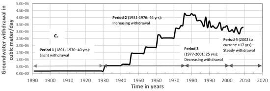 Artificial primary consolidation first occurred in the early 1900s in areas where ground water, oil, and gas were extracted. It continued throughout the 20th century due primarily to groundwater pumpage [,]. Groundwater withdrawal in the Houston-Galveston region experienced the following four periods (see Figure 6c) []: 1) Slight withdrawal of about 0.19 million m3/day from 1891 to 1930 for 40 years; 2) Increasing withdrawal rates for 46 years from 0.57 million m3/day in 1931 to 4.28 million m3/day in 1976 with an average growth of 0.05 million m3/day per year. Near Texas City the withdrawal of ground water for public supply and industry caused more than 0.5 m of subsidence between 1906 and 1943 []; 3) Decreasing withdrawal rates for 25 years from 4.28 million m3/day in 1976 to 3.03 million m3/day in 2001; and 4) Roughly stable withdrawal rates of around 3 million m3/day from 2001 to current for more than 17 years.