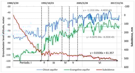 Groundwater levels in Chicot and Evangeline aquifers and land subsidence at extensometer site Southwest in the Houston-Galveston region. Calculated consolidation rates corresponding to groundwater levels during the following periods I (; II (8/16/1990 to 3/25/1993): (rebounding), and (rebounding from Equation (3)); III (3/25/1993 to 1/22/1998): and ; IV (1/22/1998 to 9/20/2000): and ; V (9/20/2000 to 9/18/2003): and ; and VI (9/18/2003 to 12/31/2017): and . The slope values in the trend equations for groundwater levels are expressed in m/day and the slope value in the trend equation for subsidence is in mm/day.