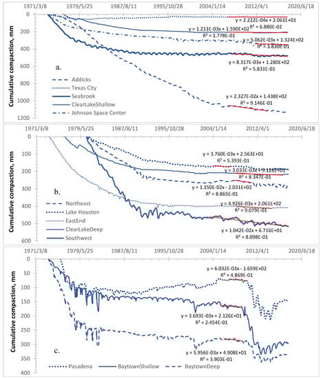 Linear trends of secondary consolidation from observed cumulative compactions at 13 extensometer locations in the Houston-Galveston region (data source: USGS). The secondary consolidation period for each site is given in Table 2. The slope values in the trend equations are in mm/day. (a): 5 extensometers Addicks, Texas City, Seabrook, ClearLakeShallow, and Johnson Space Center; (b): 5 extensometers Northeast, Lake Houston, EastEnd, ClearLakeDeep, and Southwest; and (c): 3 extensometers: Pasadena, BaytownShallow, and BaytonDeep.
