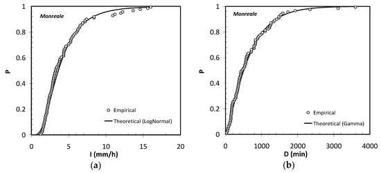 In particular, the results showed in Figure 9 confirm how the statistical dependence between storm duration and rainfall intensity can be adequately modelled by applying the Frank’s copula and how the selected marginal distributions, for each considered variable, allow their correlation structure to be well respected.
