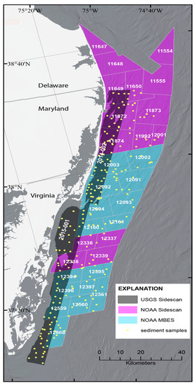 NOAA carried out 31 hydrographic surveys between 2006 and 2013 at 40-m line spacing using multibeam echosounders and sidescan sonars, over more than 5000 square kilometers of the mid-Atlantic inner-continental shelf adjacent to the Delmarva Peninsula, in water depths of 2.5 to 37.5 m, for the purposes of updating nautical charts (Figure 1 and Figure 2; Table 1) [3,4,5,6,7,8,9,10,11,12,13,14,15,16,17,18,19,20,21,22,23,24,25,26,27,28,29,30,31,32,33]. In 2014 and 2015, the U.S. Geological Survey collected swath bathymetry, sidescan sonar, chirp and multi-channel boomer seismic-reflection profiles, bottom photographs, and sediment samples at 200-m line spacing over some of the same area, for the primary purpose of acquiring seismic data [34,35]. Coincident swath bathymetric and backscatter data provided the opportunity for change-detection comparisons with the hydrographic surveys [36,37], while bottom photographs and samples, collected with a GoPro modified, SEABed Observation and Sampling System (SEABOSS), provided validation [38]. These two regional mapping efforts by the USGS and NOAA provided a wealth of seafloor data and an opportunity to combine datasets and use the hydrographic data beyond its original intent while at the same time increasing the resolution and extent of the USGS framework study. This data collaboration optimizes resources, expands coverage, and is an example of the “map once, use many times” mantra that exemplifies interagency and interdisciplinary cooperation.
