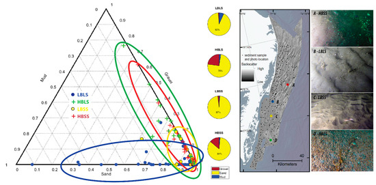 Ternary diagram depicts the sediment samples within each class. Ellipses are drawn around the majority of samples within each class to highlight the representative sediment signature associated with each. The four pie charts represent the average sediment composition in each class: LBLS, high backscatter areas with low seafloor slopes (HBLS), low backscatter areas with steep slopes (LBSS), and high backscatter areas with steep slopes (HBSS). The map and photos on the right-hand side show the sediment sample and photo locations with representative seafloor photos, one for each class.