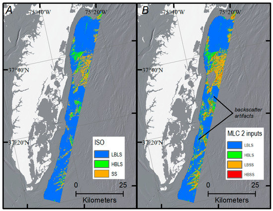 (A) ISO classification on the test area, using slope and backscatter intensity. (B) MLC on the test area using slope and backscatter intensity.